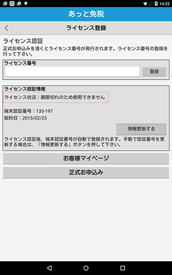 初回導入時や端末入れ替え時は、あっと免税の設定「ライセンス登録」から、発行されたライセンス番号を登録しライセンス認証をおこないます。