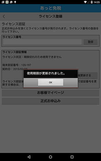 継続: 「あっと免税」と「サーバ」間でライセンス番号の有効期限を確認します。