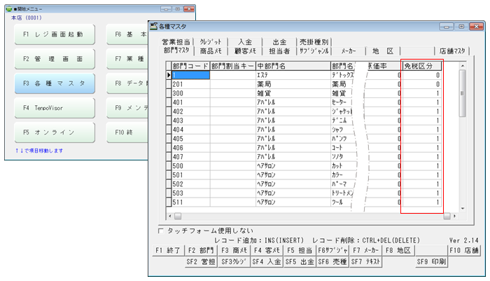 部門マスタで「消耗品」と「一般免税品」「免税除外品」を設定します。