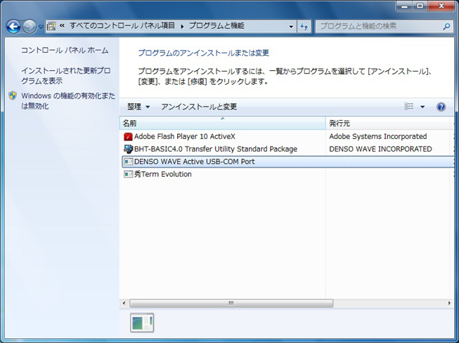 ② 「DENSO WAVE Active USB-COM Port」をアンインストールします。