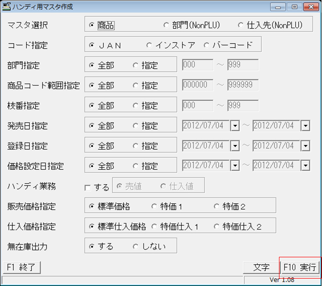 ② ハンディメンテナンスが開きますので、条件を指定して「F10 実行」を押します。